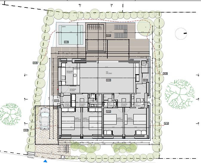 Single-family house with swimming pool in traditional wood and thatch construction.